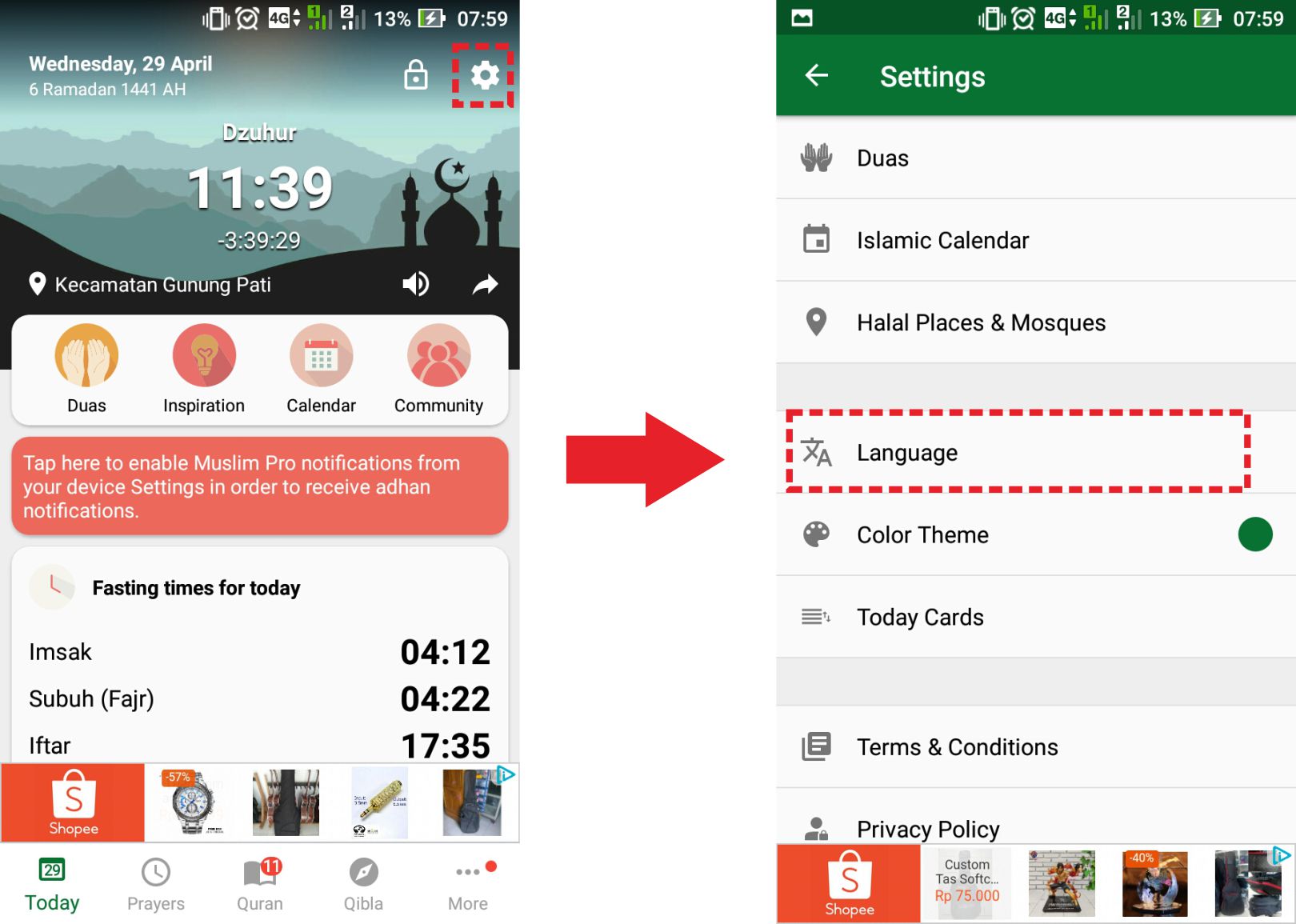 1. Terlebih dahulu, kita harus melakukan pengaturan bahasa. Tujuannya adalah untuk memudahkan kita dalam memilih dan membaca doa-doa yang ada. Pada halaman utama, klik logo pengaturan. Langkah selanjutnya, pada menu pengaturan pilih language.