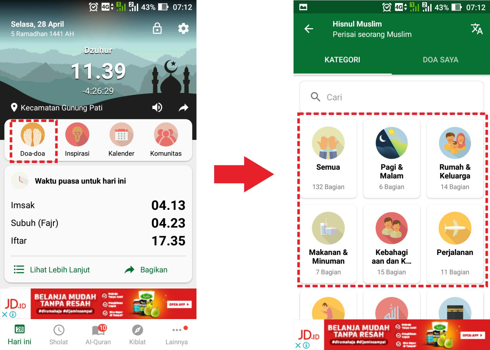 Aplikasi Muslim Pro merupakan salah satu aplikasi pada smartphone yang dapat membantu kita dapat mengerjakan amalan ibadah sehari-hari, dimanapun dan kapanpun kita berada. Salah satu fitur untuk beribadah yang terdapat pada aplikasi Muslim Pro yaitu fitur doa-doa harian. Dengan adanya fitur ini, tentu akan memudahkan kita dalam membaca doa.