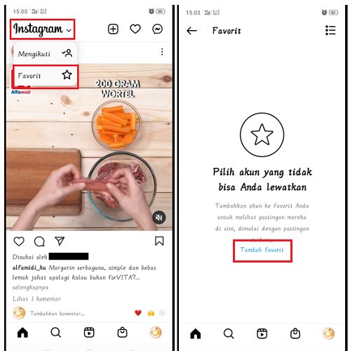 2. Ada dua cara menggunakan fitur favorit di Instagram. Cara pertama, scroll kebawah halaman utama aplikasi Instagram untuk menampilkan ikon panah bawah disamping tulisan Instagram dan pilih menu Favorit. Kemudian, kamu akan diarahkan ke halaman Favorit, tap Tambah Favorit untuk menambahkan akun Instagram favorit kamu.