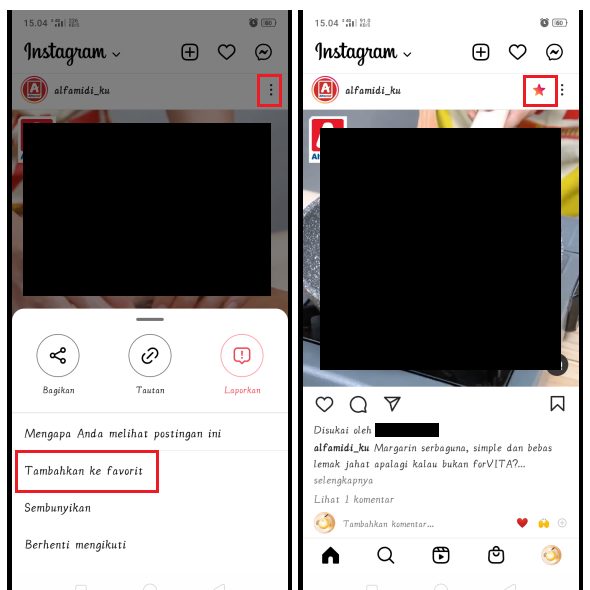 4. Cara kedua, tap ikon titik tiga di samping kanan atas postingan dari akun favorit kamu dan kemudian pilih menu Tambahkan ke favorit. Selesai kini disamping titik tiga postingan tersebut akan muncul ikon bintang, yang menandakan akun tersebut merupakan akun Instagram favorit kamu.