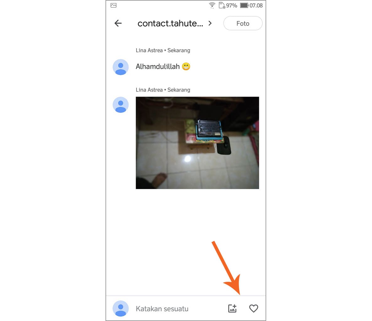 6. Sekarang kamu tinggal menunggu balasan dari pengguna yang sudah kamu kirimi foto. Ketika pengguna yang dikirimi foto memberikan balasan, maka kamu bisa menggunakan tombol suka atau menambahkan gambar lagi sehingga aktivitas berbagi foto dan video akan jauh lebih menyenangkan.