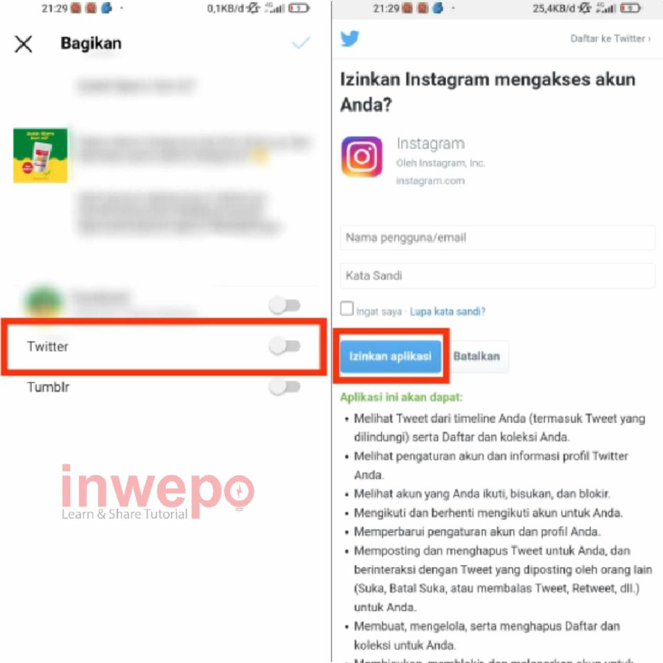 3. Tersedia 3 pilihan aplikasi yang dapat digunakan, yakni Facebook, twitter dan Tumblr. Kalian bisa pilih salah satu dengan mengaktifkan tombol di sebelah kanan. Selanjutnya kalian tinggal masuk ke akun media sosial kalian dan memberi izin akses untuk Instagram.