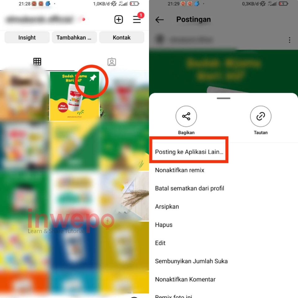 2. Postingan maupun reels yang di sematkan atau di Pin Post akan terdapat icon pin. Selain pin kalian juga bisa langsung mengirim gambar atau mengupload ke jejaring media sosial yang lain dengan tap Posting ke Aplikasi Lain.