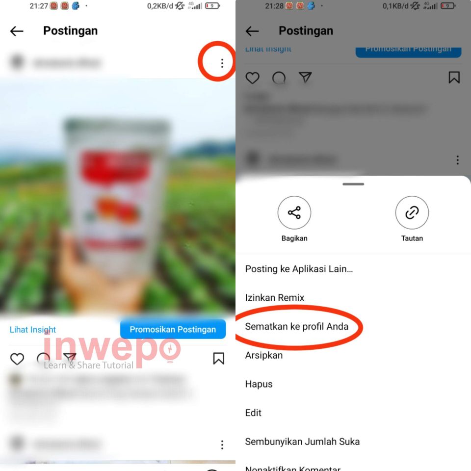 1. Buka Instagram, lalu pilih salah satu postingan bisa postingan lama. Kemudian tap 3 titik untuk memunculkan menu yang lain. Berikutnya pilih menu Sematkan ke profil anda.