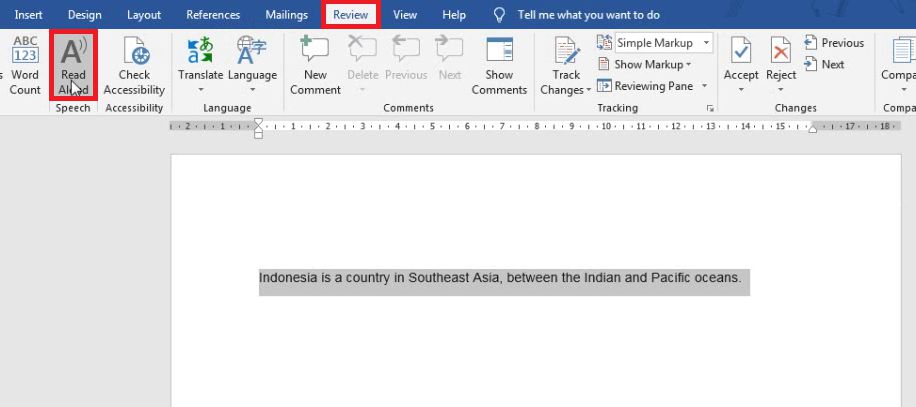4. Lalu kamu klik pada menu tab Review dan klik pada tombol Read Aloud yang menggunakan ikon huruf A besar.