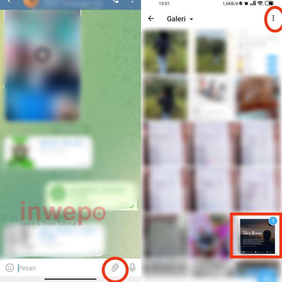 1. Buka salah satu kontak chat, lalu pilih icon lampiran untuk menambahkan media yang akan di blur ( spoiler ). Pilih salah satu foto yang akan dikirim, jika sudah tap 3 titik yang ada di pojok kanan atas untuk memunculkan menu yang lain.