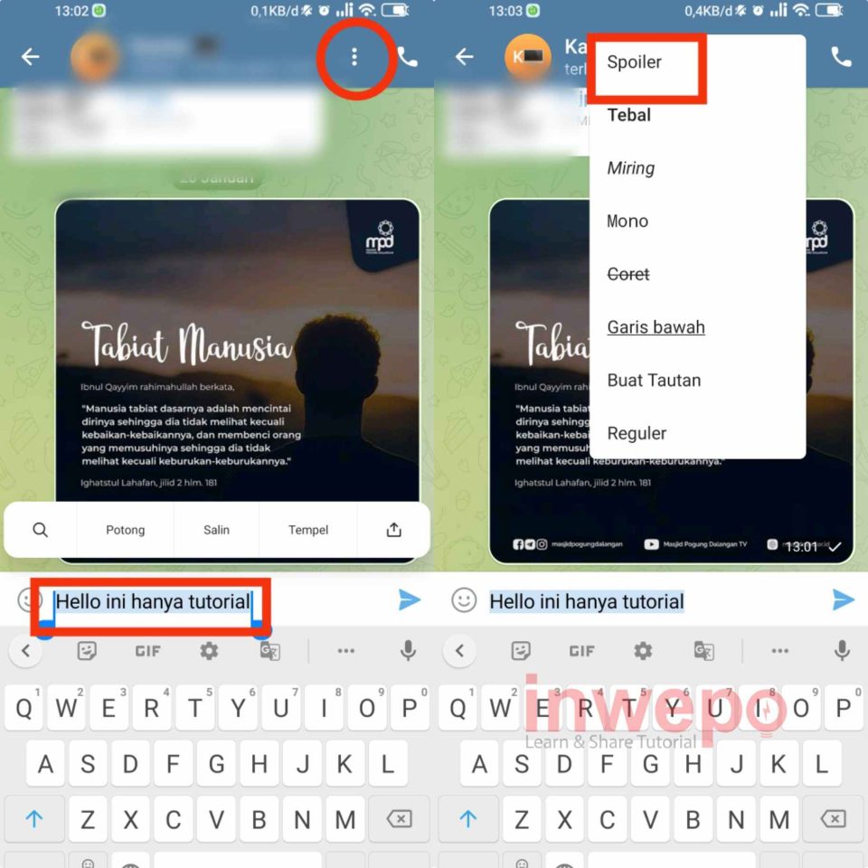 3. Selain untuk media, fitur spoiler juga tersedia untuk menutupi chat yang akan di kirimkan. Caranya cukup simpel, kalian hanya butuh memblok tulisan yang sudah kalian buat lalu tap 3 titik yang ada di bagian atas berikutnya tap menu Spoiler.