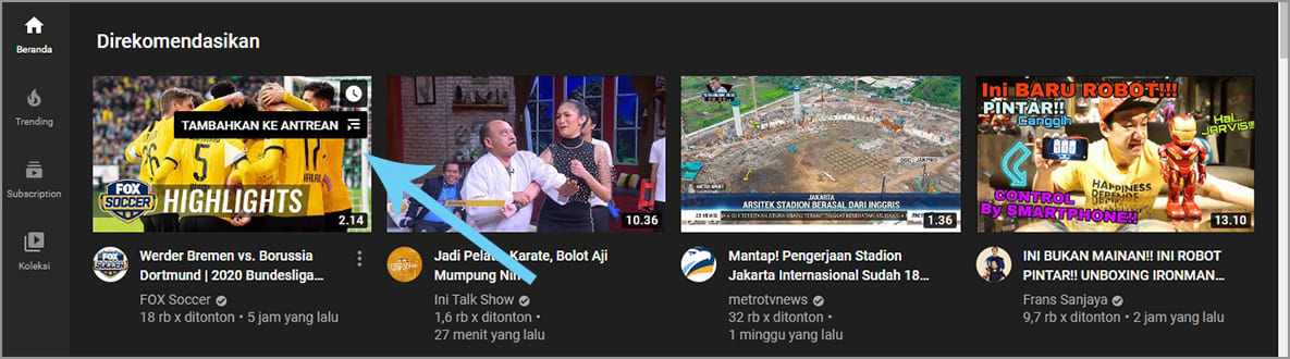 2. Pilih video yang ingin kamu masukkan ke dalam antrean dengan mengarahkan kursor ke sisi kanan thumbnail, kemudian klik tambahkan ke antrean.