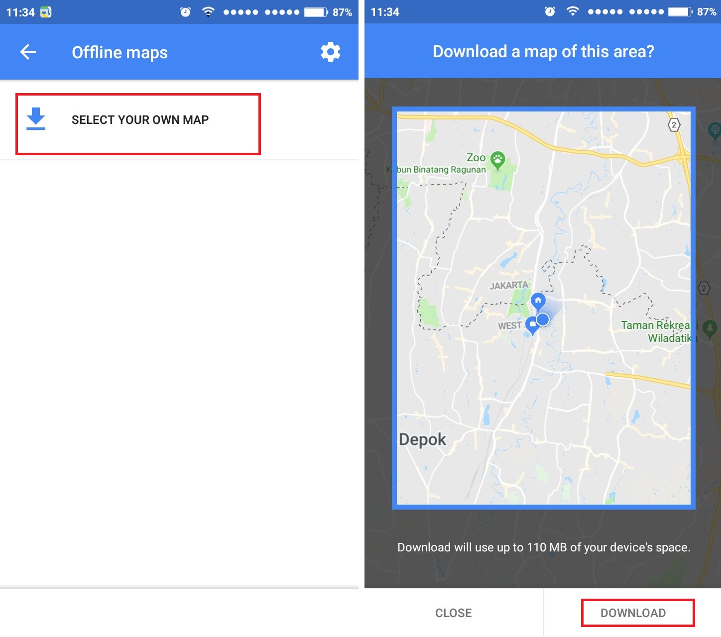 2. Selanjutnya Tap SELECT YOUR OWN MAP (pilih peta anda sendiri) – pilih lokasi dengan mengeser area kotak tersebut untuk menentukan lokasi yang ingin kamu download offline – Download