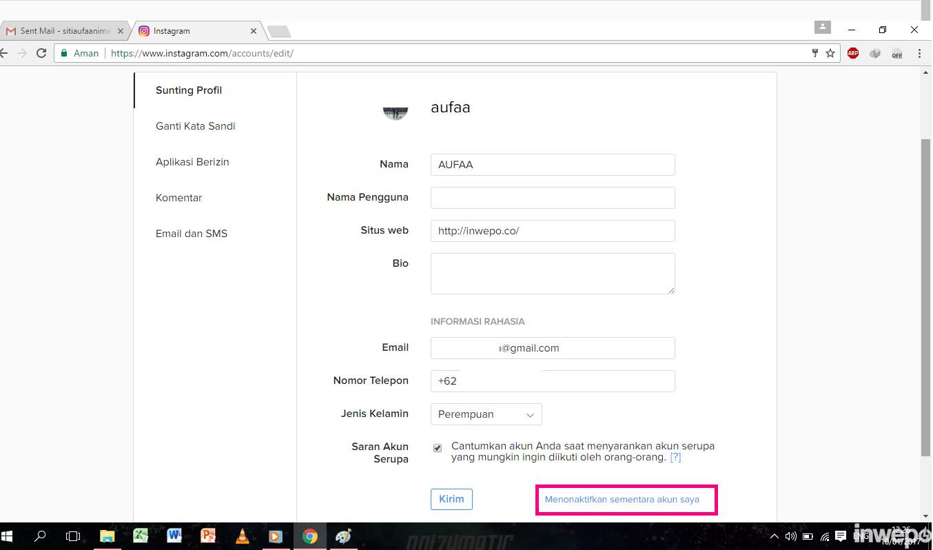 4. Setelah kalian masuk ke halaman profil, langsung scroll ke bagian bawah hingga menemukan tulisan menonaktifkan sementara akun saya dan langsung di klik untuk menonaktifkan akun kalian sementara.
