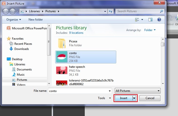 3. Cari dan pilih file gambar yang akan kita hapus background-nya, dalam tutorial ini kita coba dengan file conto.jpg, kemudian klik insert.