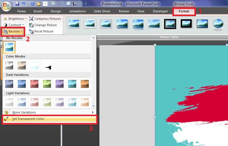 4. Kemudian klik tab format, lalu klik recolor, kemudian klik set transparent color.