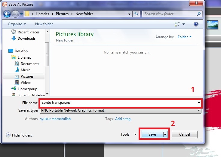 8. Kemudian cari lokasi dimana kamu ingin menyimpan file gambarnya, lalu beri nama, pada tutorial ini kita beri nama “conto transparan.png”, kemudian klik save.