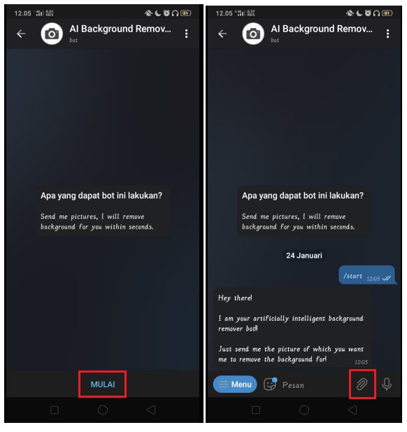 3. Setelah kolom chat bot AI Background Remove muncul, langsung saja tekan tombol Mulai untuk bisa menggunakan bot AI Background Remove. Kemudian bot akan mengirimkan pesan yang berisi cara menghapus background di bot AI Background Remove.
