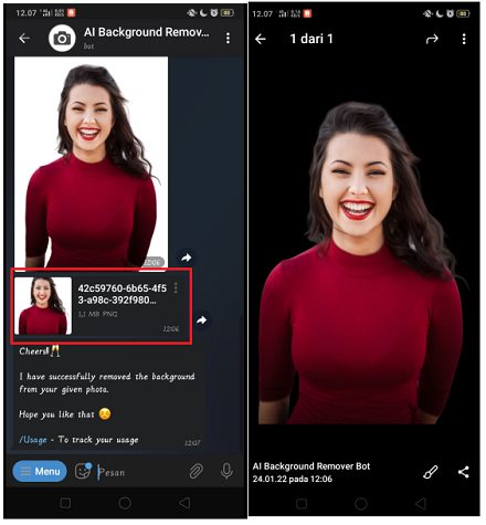 Bagaimana? Mudah sekali bukan menghapus background foto menggunakan bot Telegram. Selain prosesnya yang cepat dan tidak perlu mendownload dan manggunakan aplikasi tambahan, hasilnya hapus background di foto cukup memuaskan. Setelah kamu menyimpan foto yang sudah dihapus backgroundnya ke gelleri perangkat smartphone kamu, kini kamu dapat menggunakan foto tersebut untuk kebutuhan membuat prodak digital kamu lainnya.
