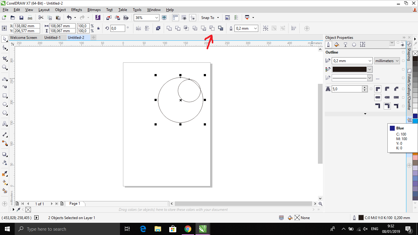 5. Klik atau Block kedua lingkaran tersebut, lalu pilih Back Minus Front padaĀ property barĀ (ditunjukkan pada gambar).
