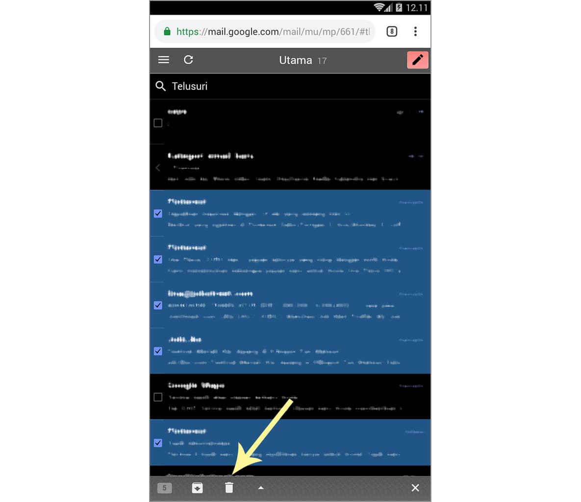 4. Silakan pilih email yang ingin dihapus dengan cara mencentangnya, kemudian ketuk ikon hapus.
