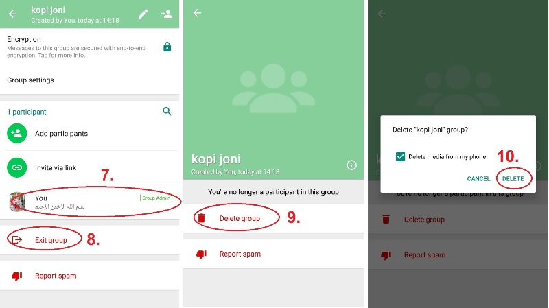 5. Apabila semua anggota sudah tidak ada yang tersisa di group tersebut – Tap Delete Group – Ceklist Delete media from my phone – Tap Delete.