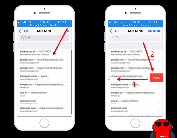 3. Pilih Kata Sandi yang mau dihapus – Geser ke kiri Kata Sandi yang mau dihapus – ketuk Hapus.