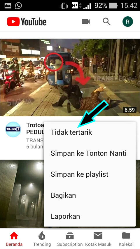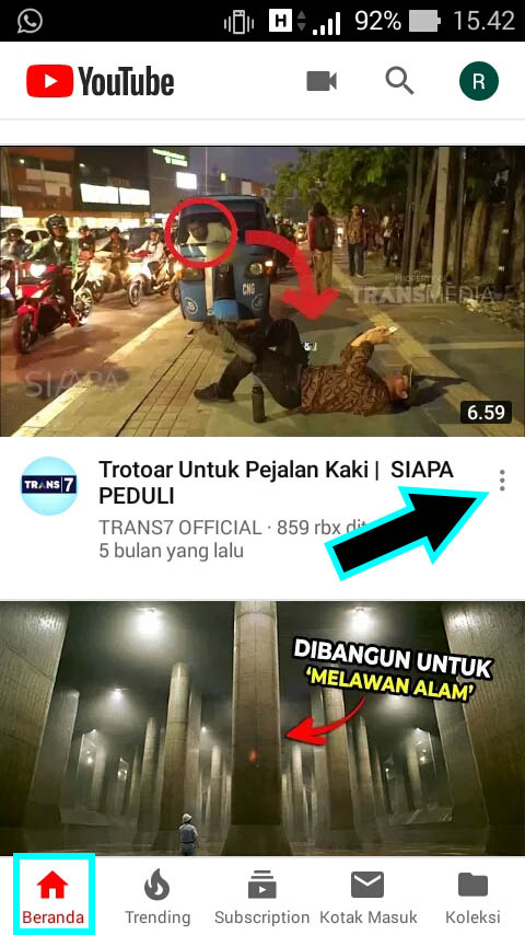 2. Pilih BERANDA, maka akan muncul video rekomendasi Youtube. Cari video yang tidak kamu butuhkan/ tidak kamu sukai di beranda dan pilih ikon “tiga titik horisontal” yang ada di pojok kanan bawah video.