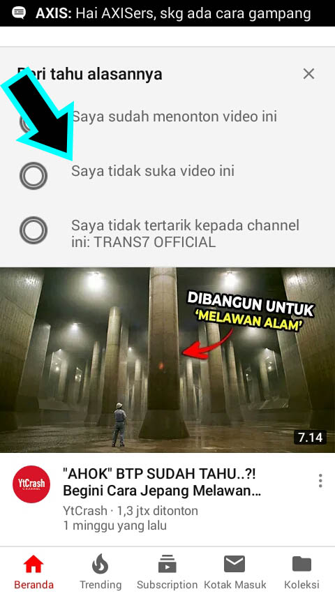 5. Pilih salah satu dari tiga opsi yang diberikan. Contoh: “Saya tidak suka video ini”. Video yang dipilih tidak akan tampil lagi di beranda kamu. Jika kamu memilih “Saya tidak tertarik kepada channel ini maka semoa video dari channel yang dipilih tidak akan tampil di beranda kamu.