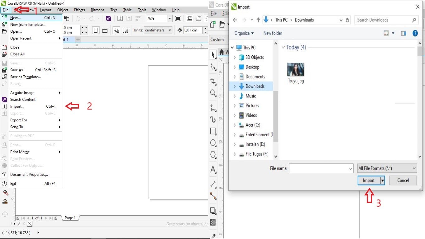 2. Selanjutnya masukkan gambar yang nantinya akan dihilangkan latar atau background nya dengan cara klik File, lalu klik Import. Maka akan muncul jendela baru disitu pilih gambarnya, setelah terpilih klik Import.