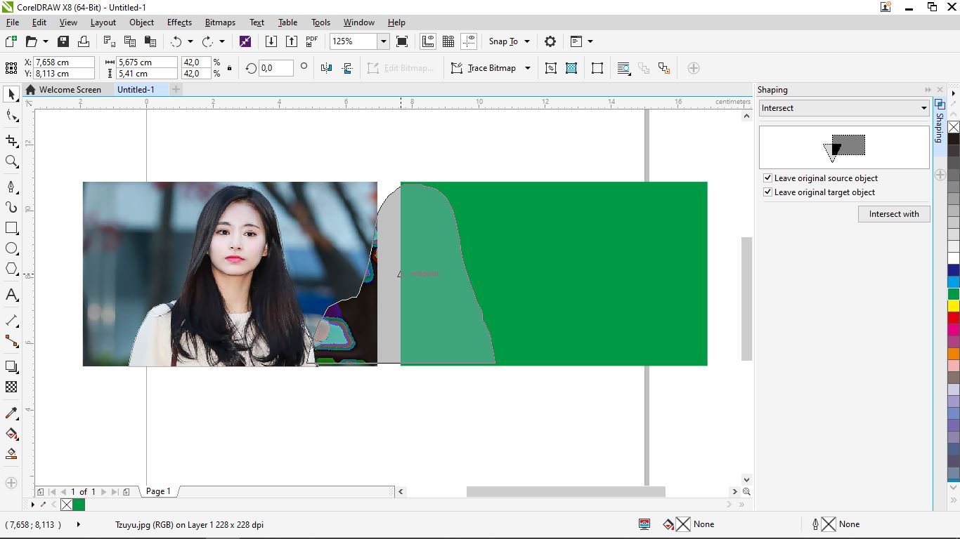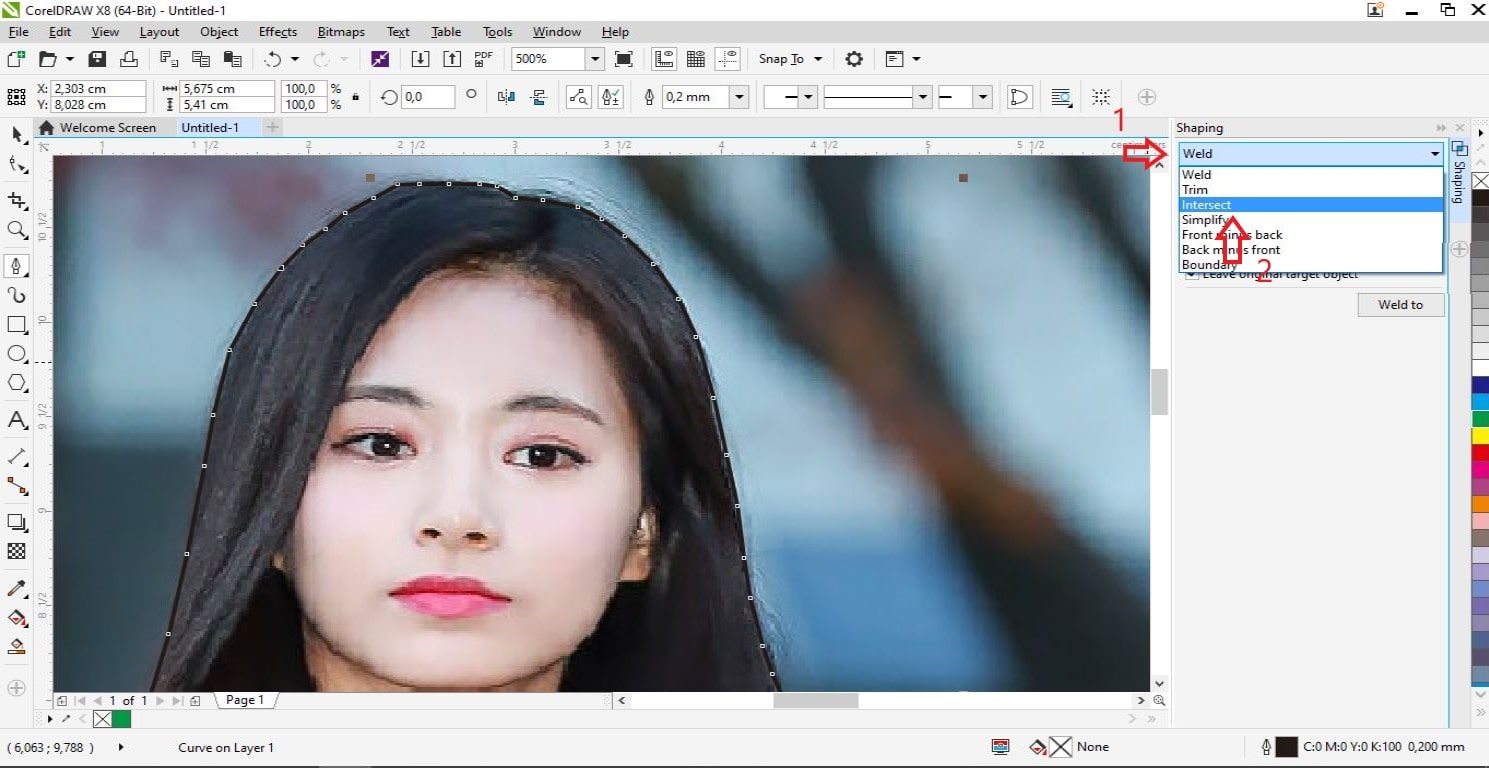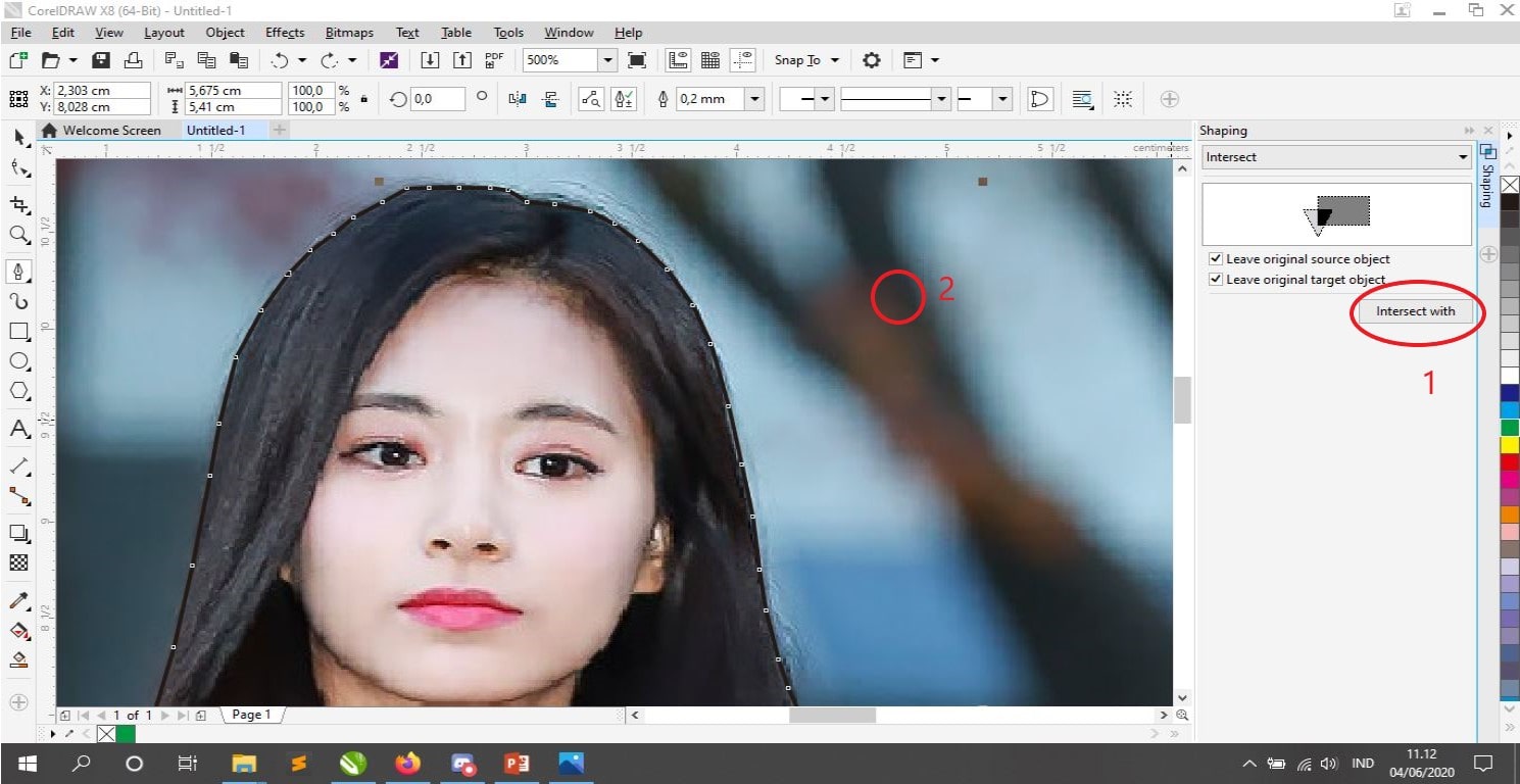 7. Klik tombol Intersect With, lalu klik terserah dimana saja pada background foto, pada gambar saya ilustrasikan di lingkaran nomor 2.