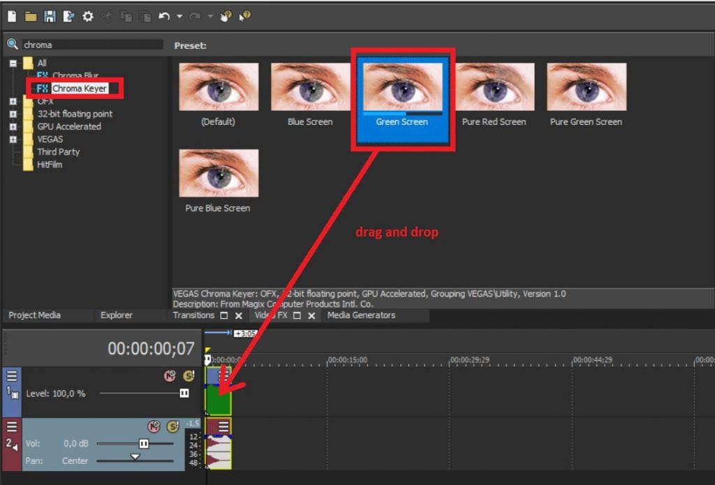 3. Pada daftar preset, kamu cari chroma keyer dan drag and drop pada pilihan green screen ke video green screen kamu di timeline lembar kerja.