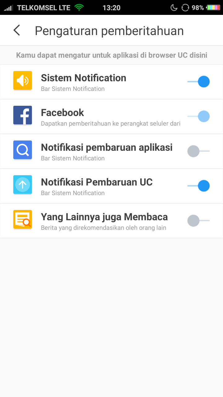 4. Matikan tombol dari biru menjadi abu-abu untuk System Notifications, App Update Notifications, UC Update Notifications, Others are reading.