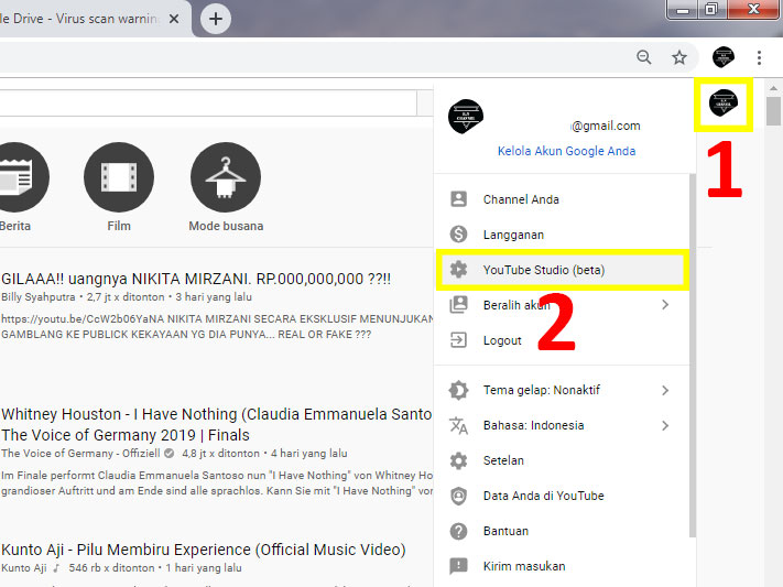 1. Log In dan masuk ke pengaturan Youtube Studio Beta dengan memilih ikon channel yang ada di sebelah kanan atas tampilan desktop.