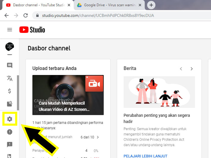 2. Setelah masuk ke halaman dasbor channel, cari ikon pengaturan yang ada di samping kiri halaman desktop.