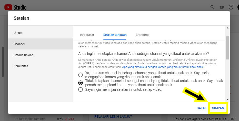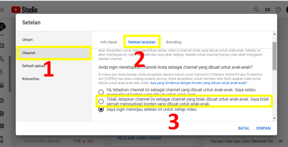3. Pada menu setelan, pilih channel, lalu pilih setelan lanjutan. Disini kamu akan menemukan pengaturan channel yang menanyakan “apakah kamu ingin menetapkan channel sebagai channel yang dibuat untuk anak-anak?”. Pilih Opsi “Tidak, tetapkan channel ini sebagi channel yang tidak dibuat untuk anak-anak”.