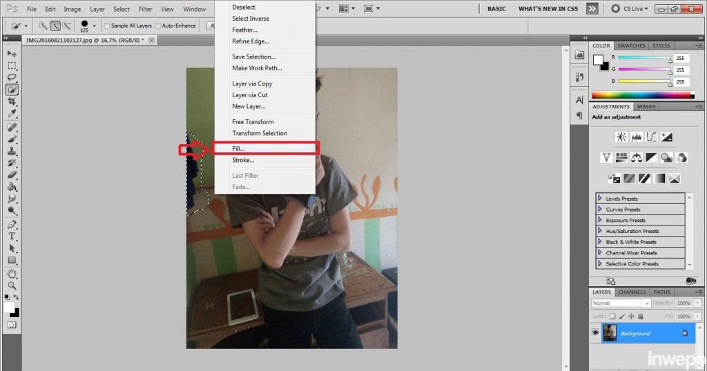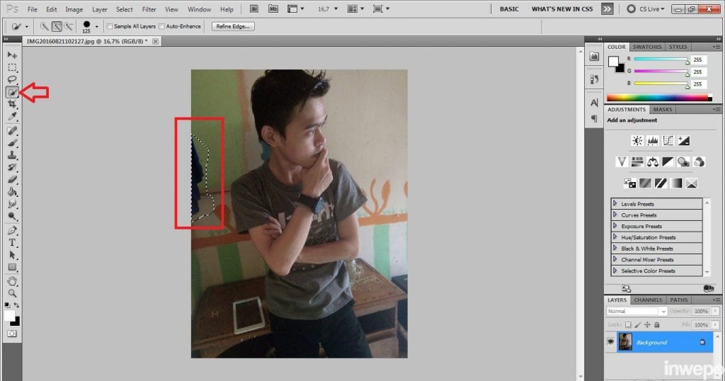 Kemudian seleksi objek yang dirasa mengganggu dan akan dihilangkan dari foto dengan menggunakan polygonal Lasso Tool / Lasso Tool atau juga bisa menggunakan Quick Selection Tool tergantung mana yang sering kita gunakan atau mudah kita gunakan.