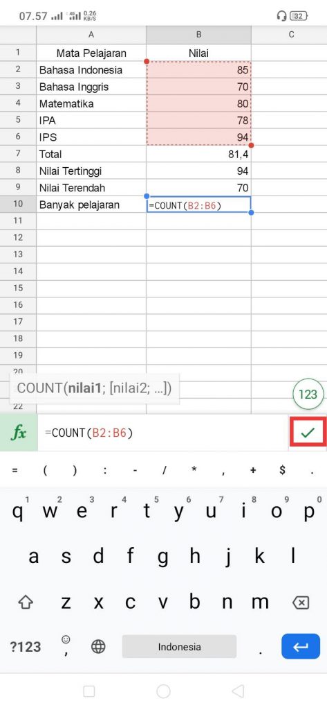 7. Blok komponen seluruh atau sebagian cell yang ingin dihitung banyaknya data angka. Setelah itu, tekan simbol ceklist hijau.
