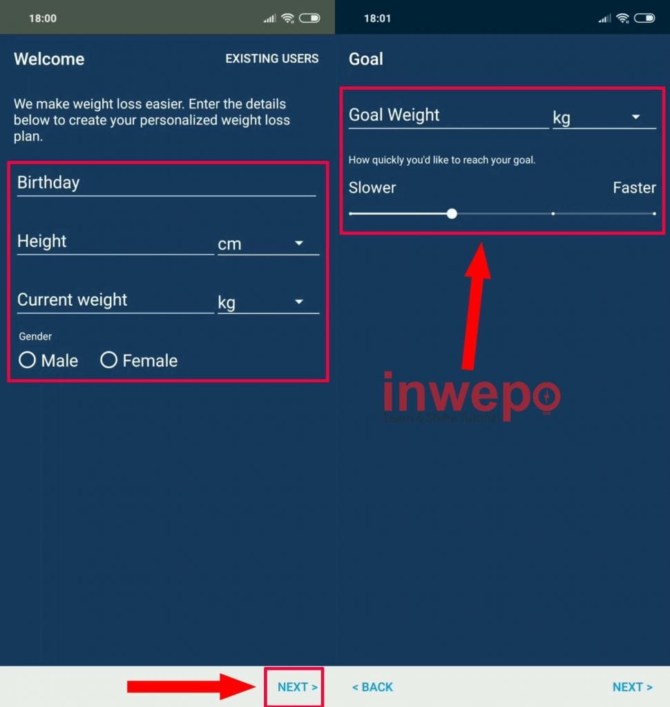 2. Buka aplikasi Lose it yang sudah terunduh, untuk pertama kali masukkan tanggal lahir kamu, tinggi badan, berat badan, dan juga jenis kelamin. Kemudian masukkan juga penurunan berat badan yang ingin di capai jika sudah tap Next.