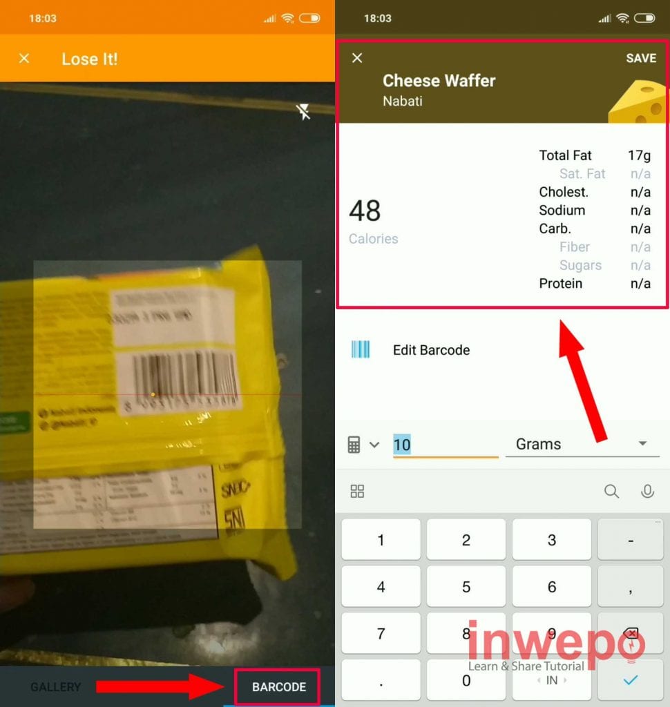 5. Pilih menu BARCODE yang berada di bawah lalu arahkan kamera ke makanan atau snack yang ada barcodenya. Setelah itu secara otomatis aplikasi akan menunjukan informasi gizi dan kalori yang ada pada makanan tersebut.