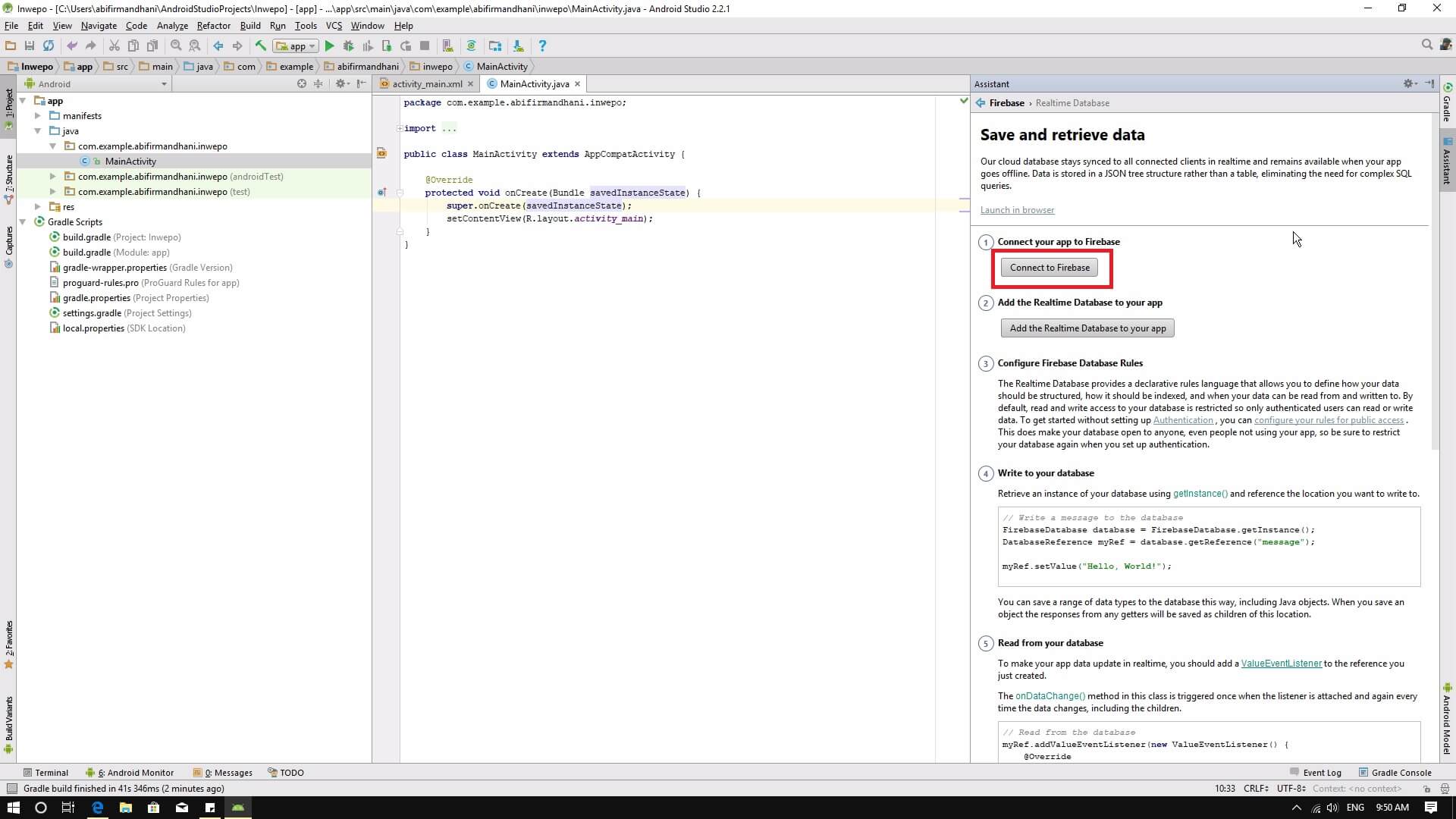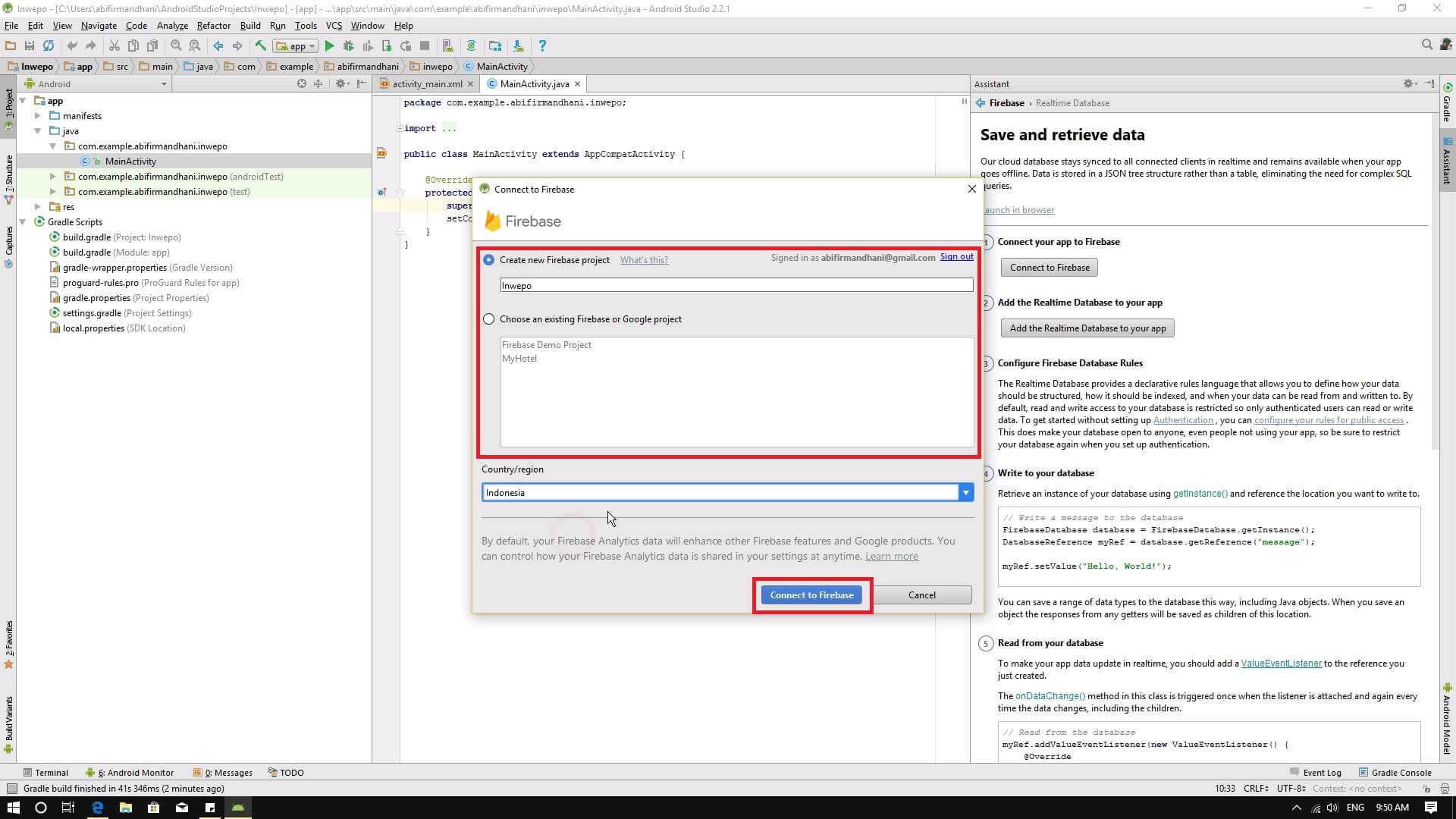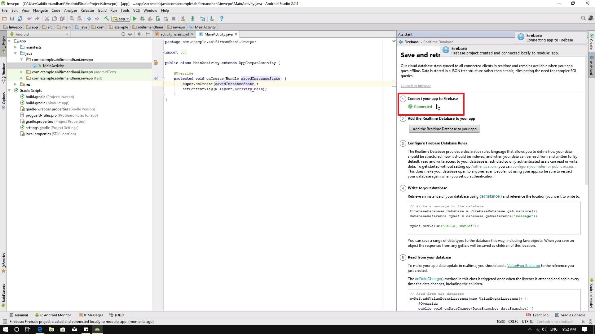 8. Firebase assistant akan memberikan beberapa langkah agar kamu bisa menggunakan realtime database. Langkah pertama adalah connect dengan firebase. Klik tombol connect to firebase