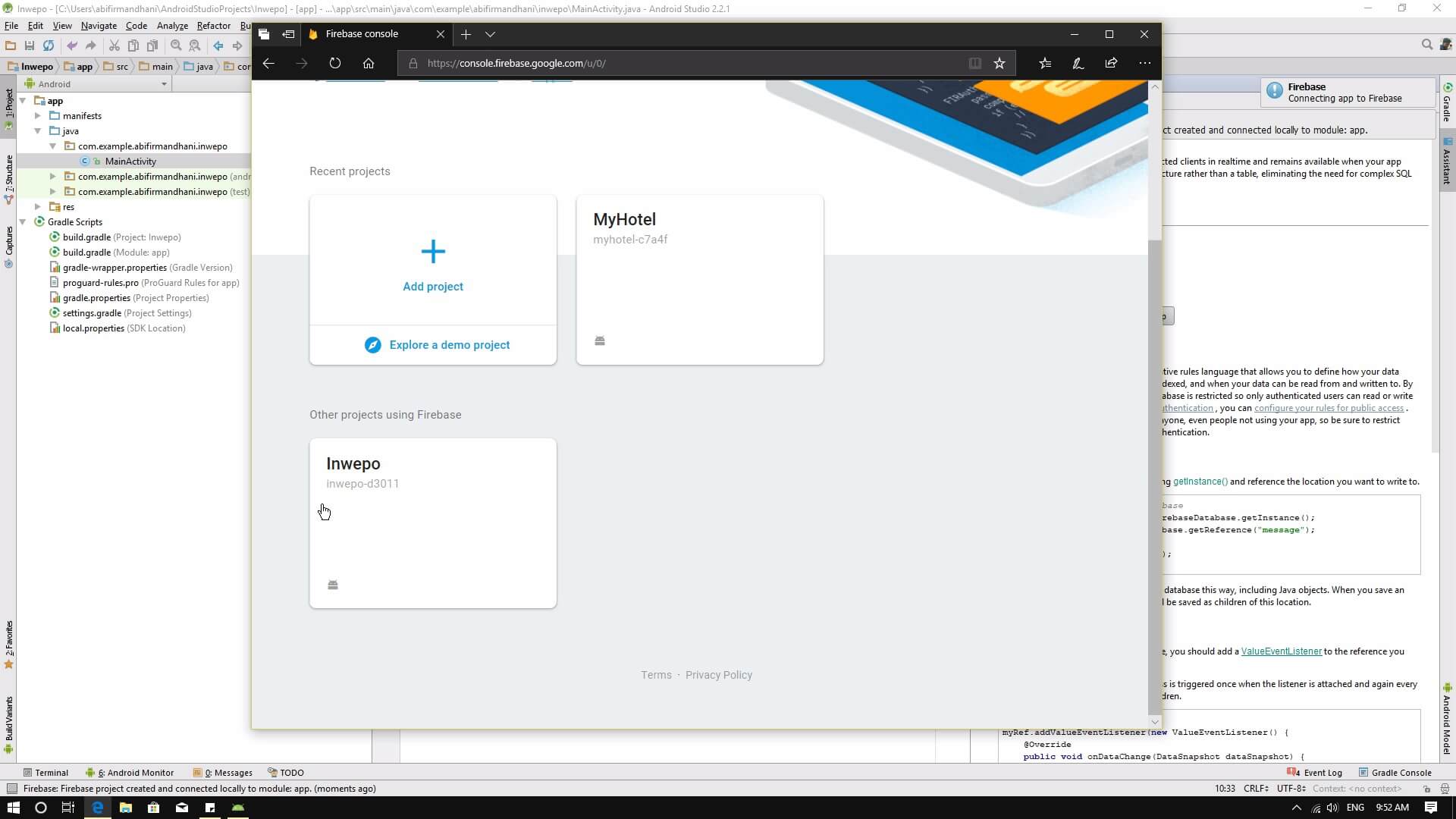 11. Buka Firebase console dan pastikan akun google kamu sama dengan yang kamu pakai di Android studio. Bisa terlihat projek yang kamu buat pada langkah sebelumnya berhasil ditambah.