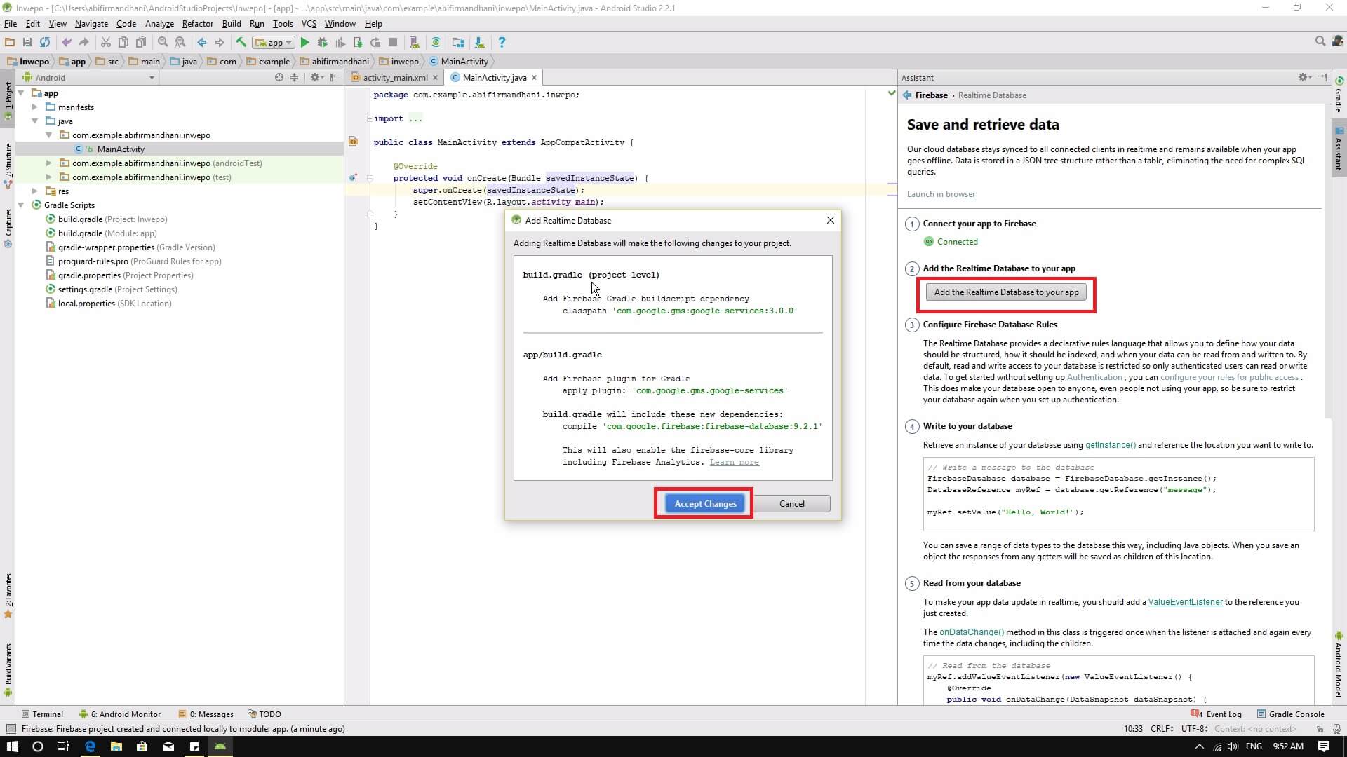 12. Lanjut ke langkah selanjutnya. Klik tombol add realtime database to your app. Pada langkah ini kamu akan menambah beberapa tools di gradle projek kamu, sehingga realtime database bisa berjalan di aplikasi kamu nantinya. Klik accept changes untuk melanjutkan.