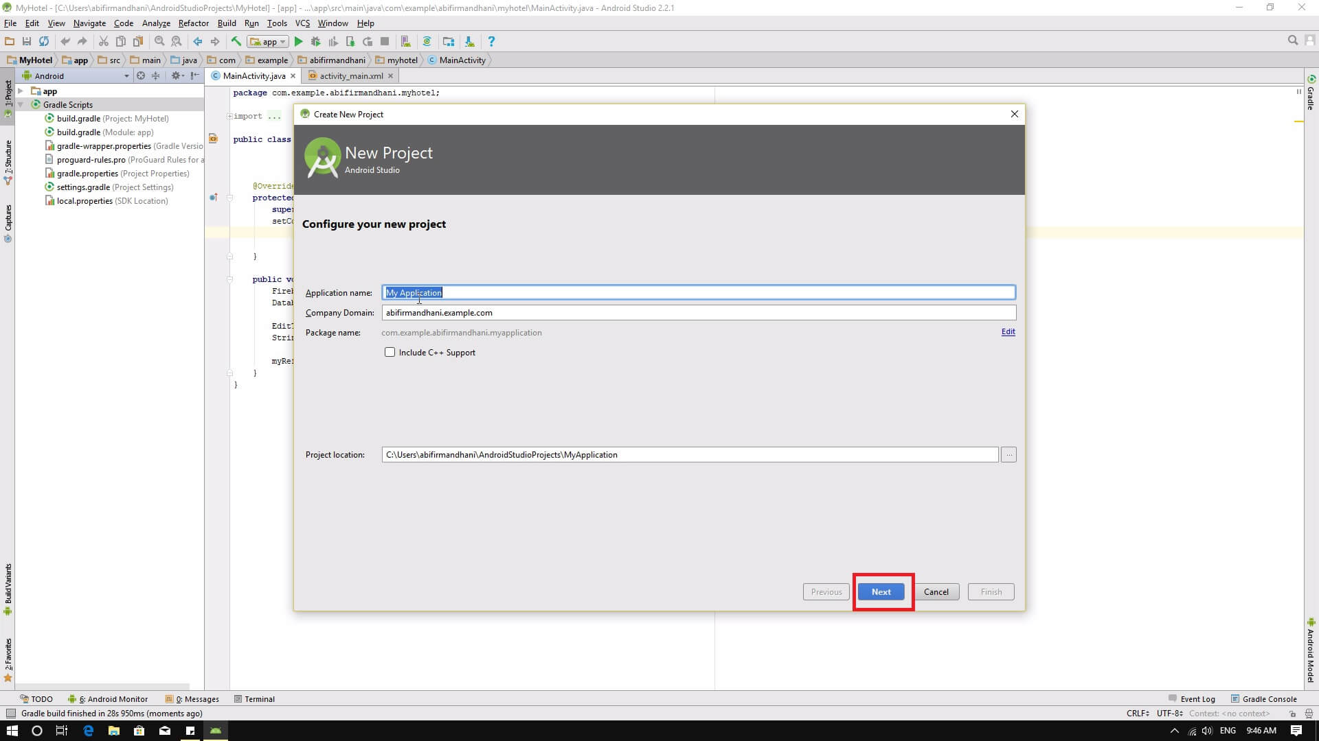 1. Buat projek baru di Android Studio kamu. Buat nama pada projek kamu dan klik tombol next.