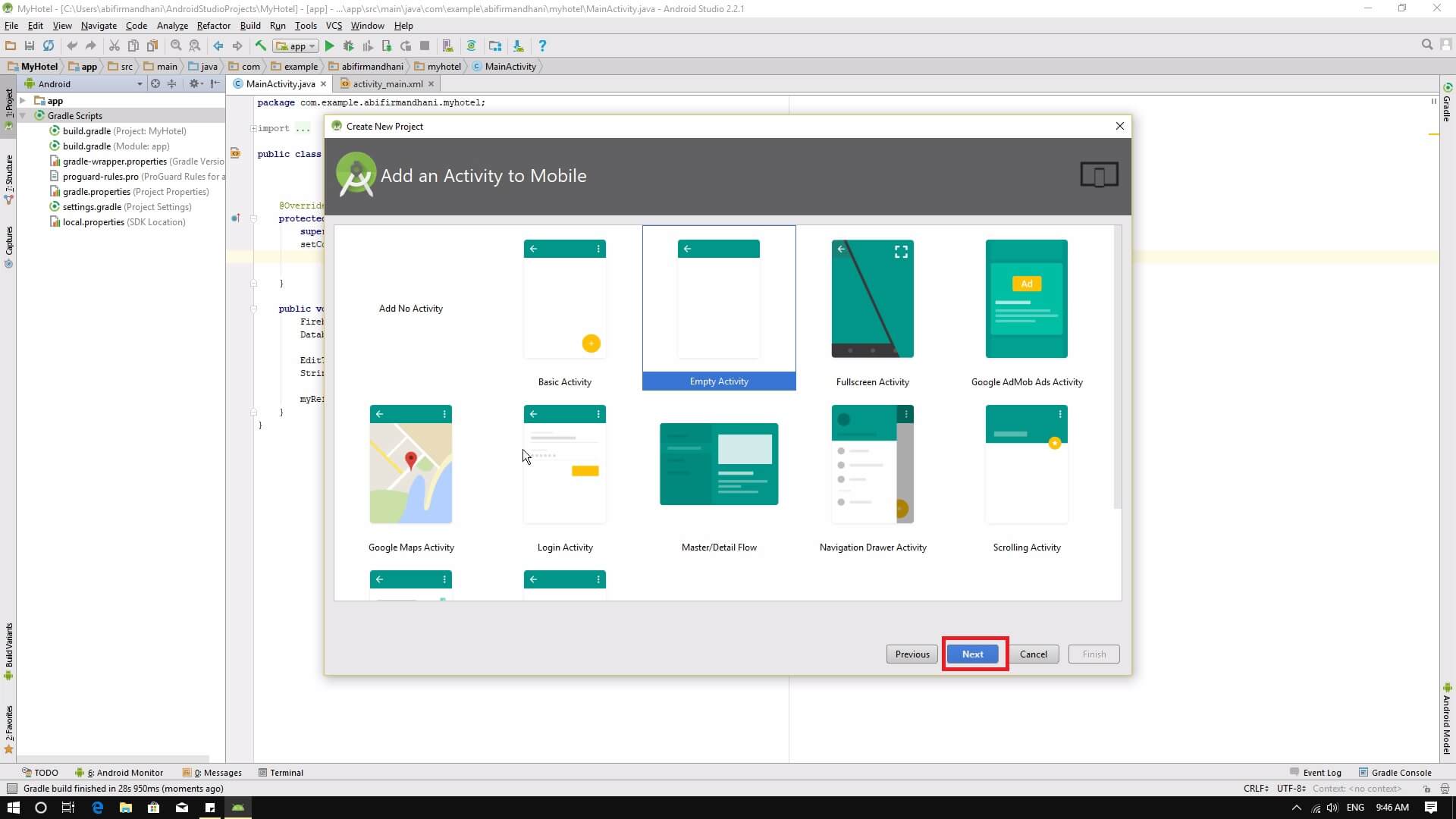 3. Pilih activity awal yang akan kamu gunakan. Pada tutorial kali ini akan menggunakan activity kosong.