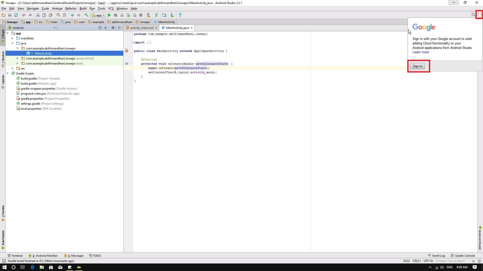 4. Saat sudah masuk ke dalam projek kamu, klik ikon user di pojok kanan atas dan Sign in dengan akun Google kamu