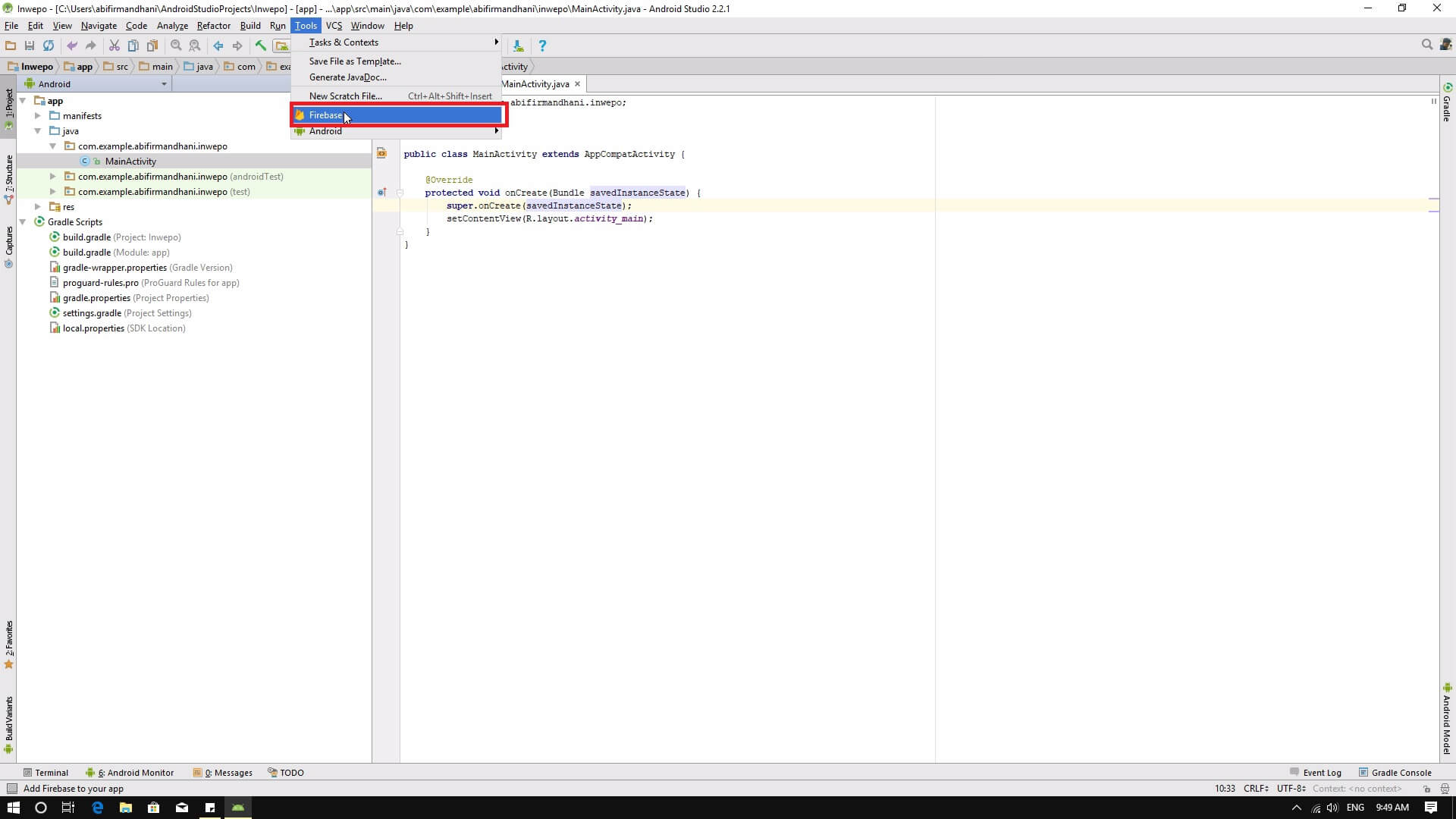 6. Lalu klik menu tools dan pilih Firebase.