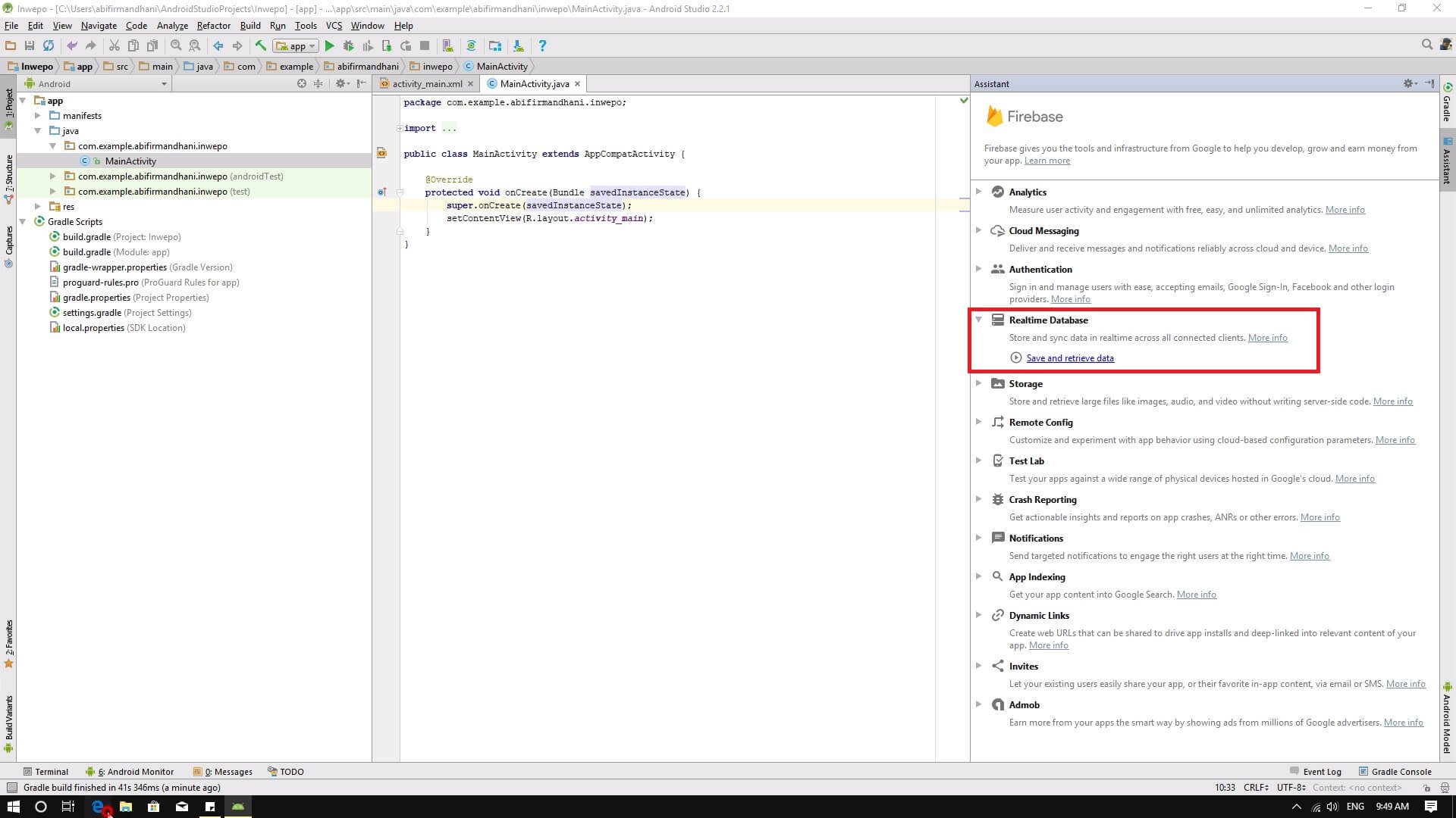 7. Akan muncul firebase assistant, dimana fungsinya adalah membantu dalam menggunakan firebase. Pilih realtime database dan klik save and retrieve data.
