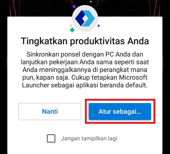 13. Jika melihat tampilan seperti gambar di bawah, kamu klik pada tombol Atur Sebagai…., dan jadikan launcher ini sebagai launcher bawaan smartphone kamu.