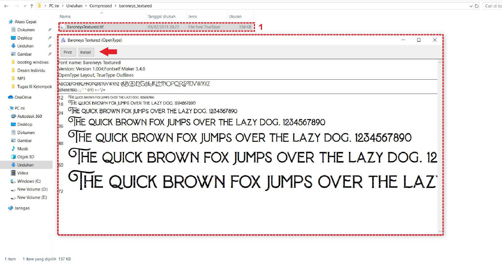 5. Buka file tersebut (tekan double klik). Setelah muncul menu tampilan model font, klik install.