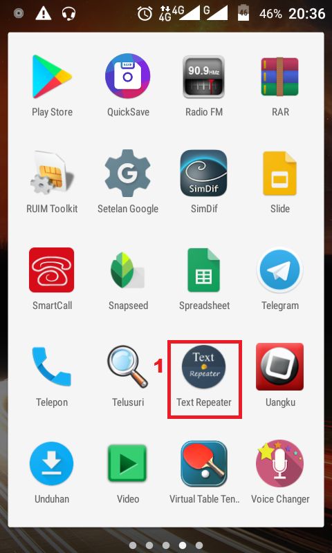 1. Install aplikasi Text Repeater di Play Store bagi kamu yang belum ada aplikasinya. Buka ikon menu utama – tekan ikon Text Repeater.