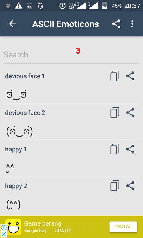 3. Silahkan cari simbol ASCII Emoticons yang sesuai keinginan. Kemudian, ketuk ikon Copy.