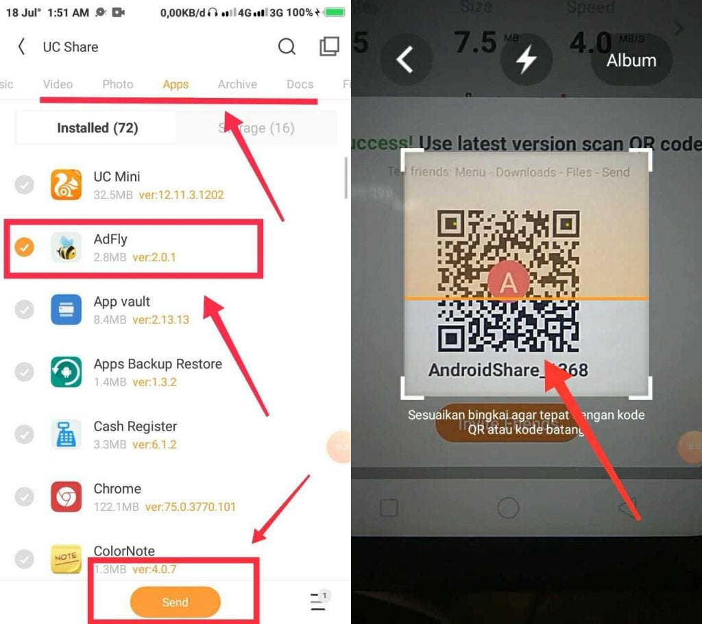 5. Setelah itu, cari dan pilih aplikasi yang akan dikirimkan. Dan klik tombol send. Lalu tunggu beberapa saat hingga nama pengguna si penerima muncul di layar dan klik untuk menscan barcode penerima.