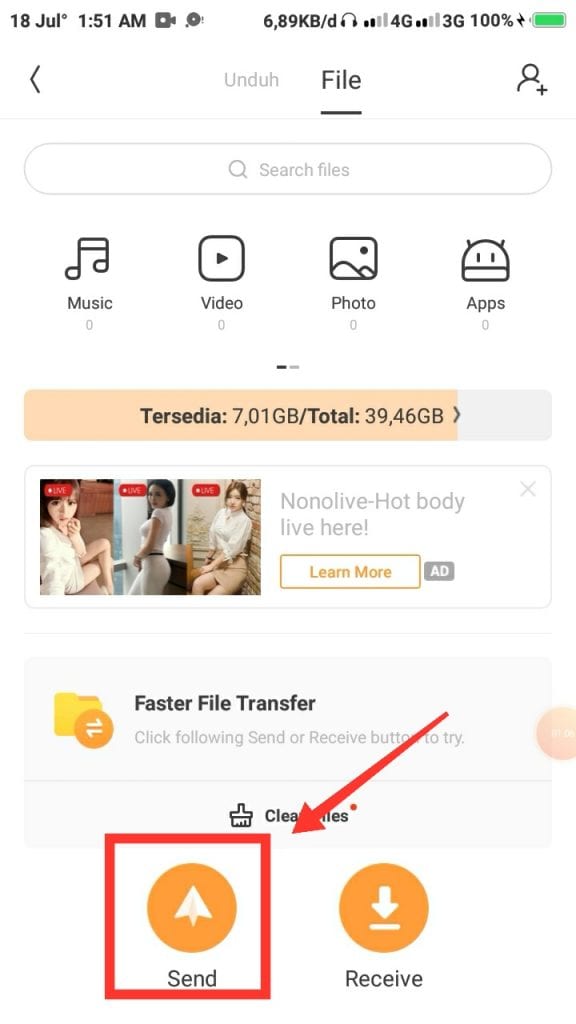 4. Setelah itu kamu bisa melihat pilihan Send (untuk mengirim) dan Receive (untuk menerima). Karena disini sebagai pengirim, klik icon Send. Dan pastikan pada ponsel si penerima memilih icon receive.